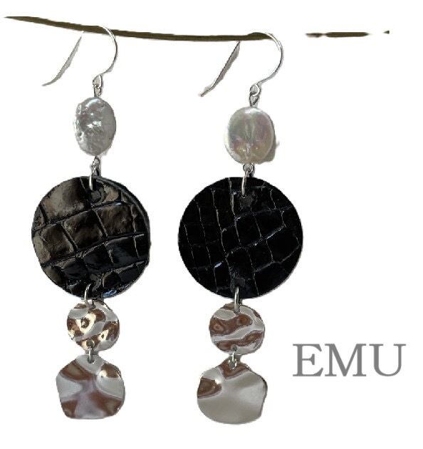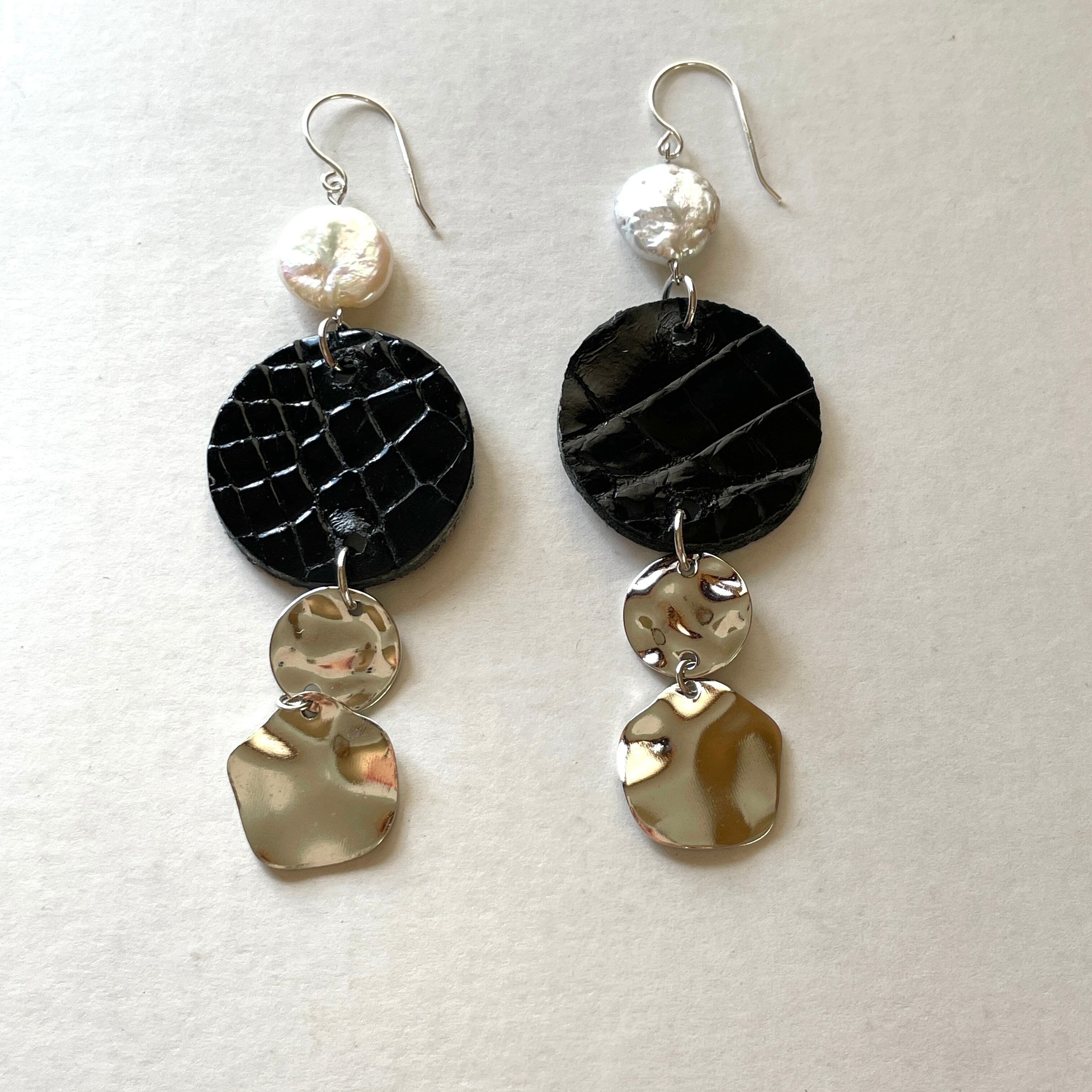 コイン型の優雅な淡水パールと独特なクロコダイルデザインの組み合わせがとてもシック、耳元で揺れるメタルチャームの煌めきが涼し気な華やかさを添えています。