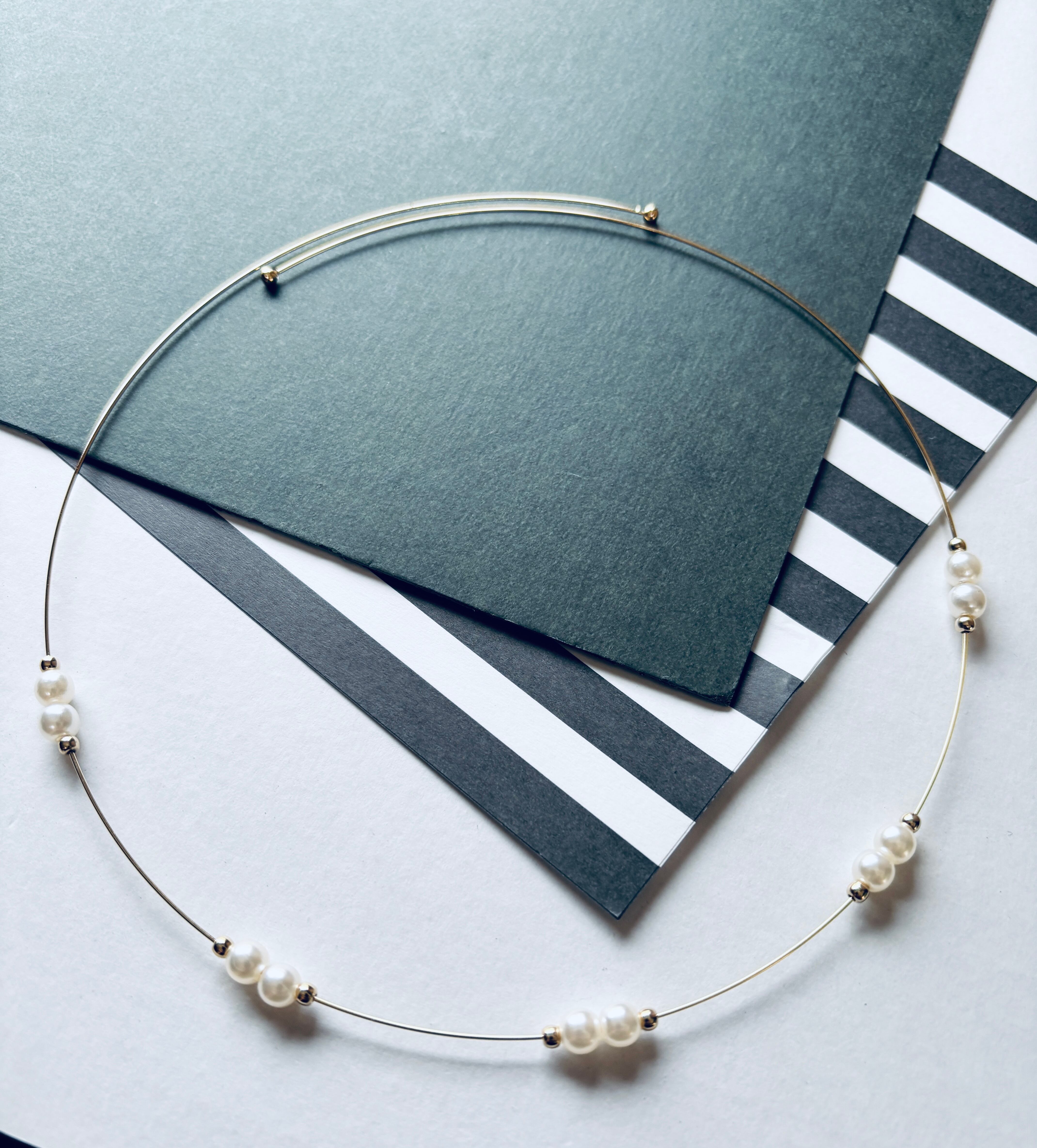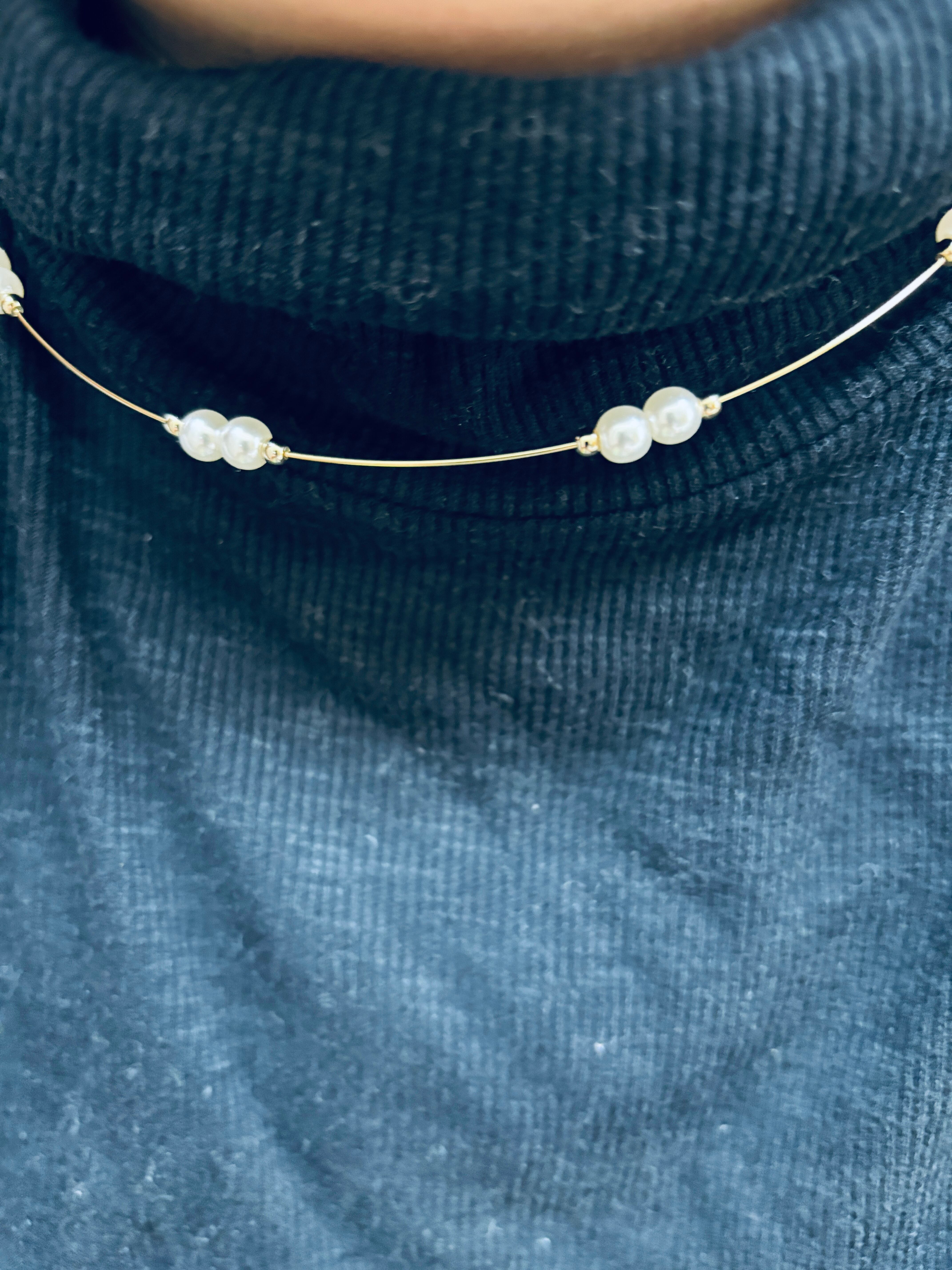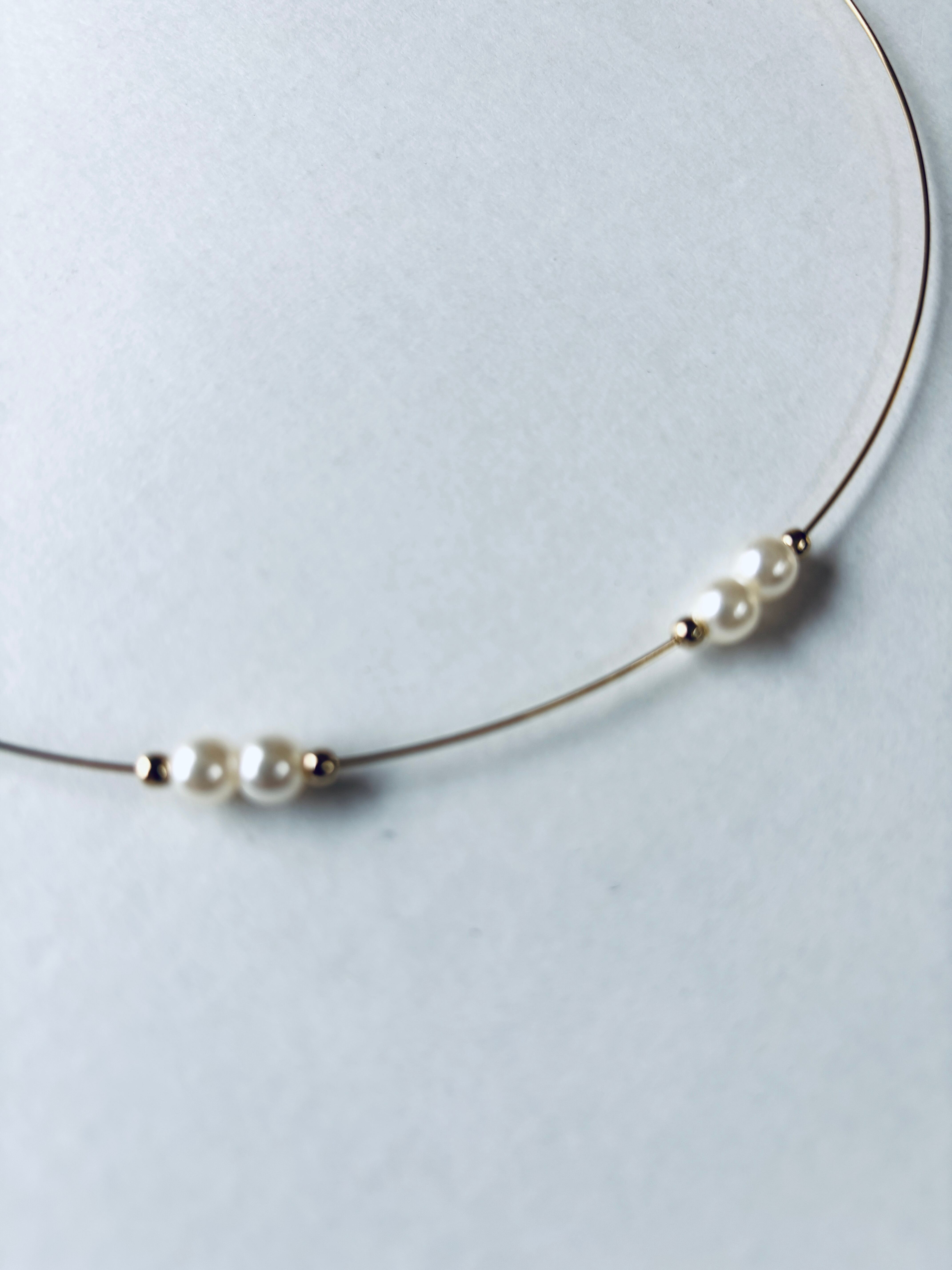 フェミニンなパールビーズでエレガントに仕上げたチョーカー風のワイヤーネックレスです。首にかけるだけの簡単装着、ゆったりフリーサイズでタートルネックの上からも装着可能です。