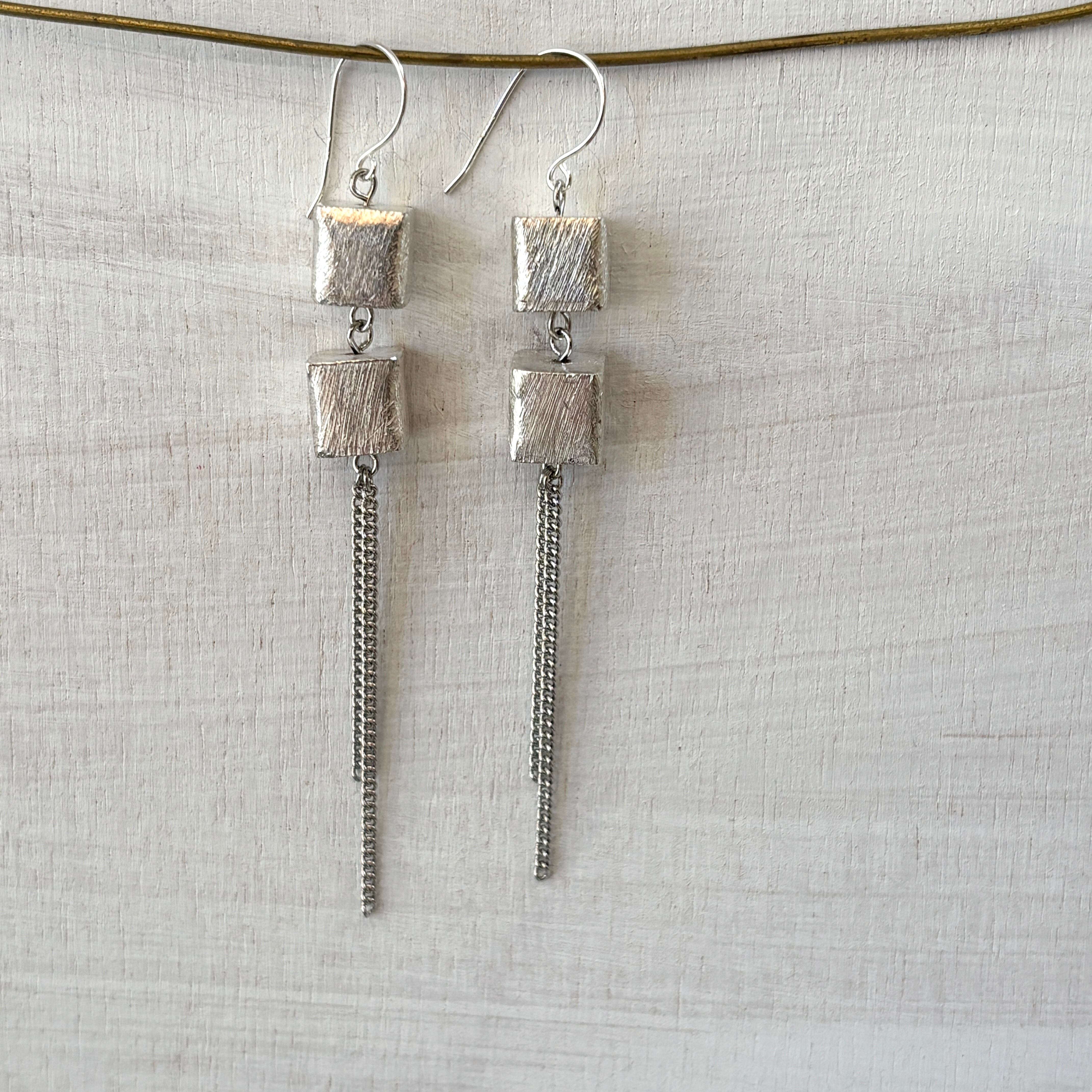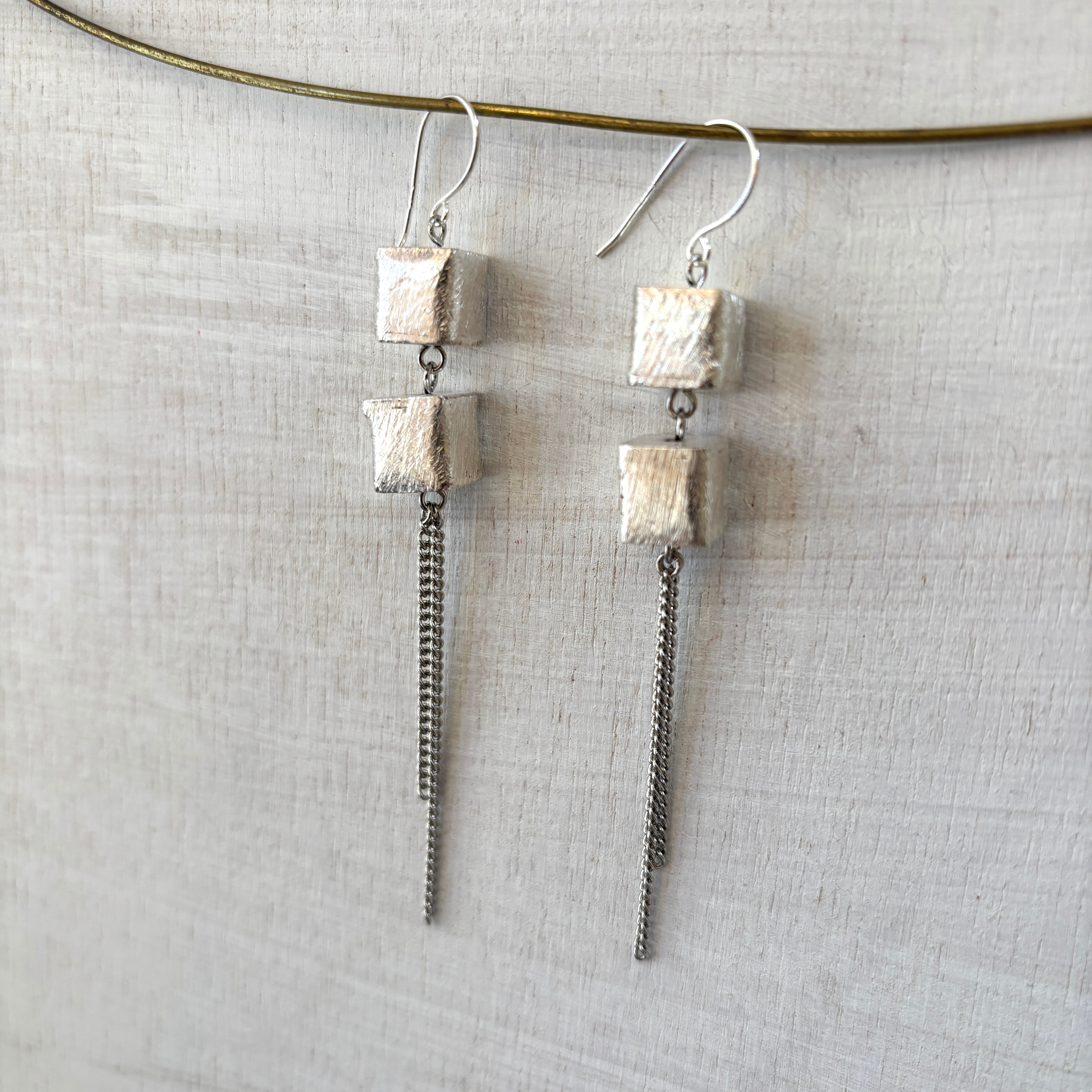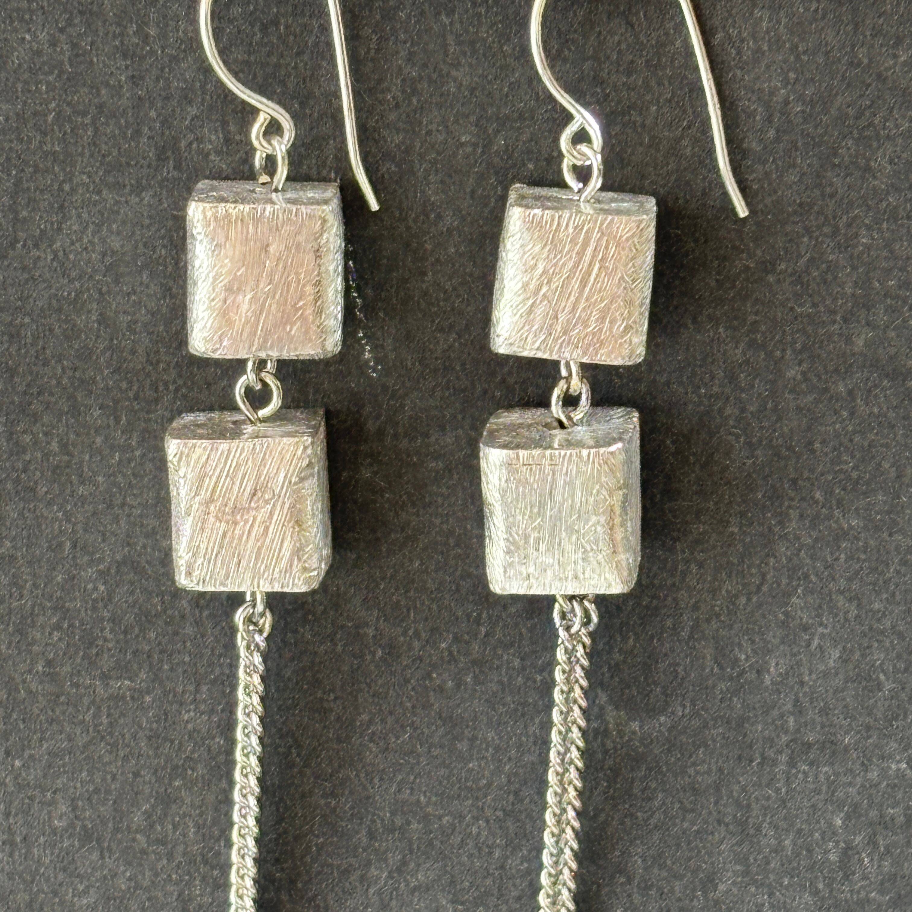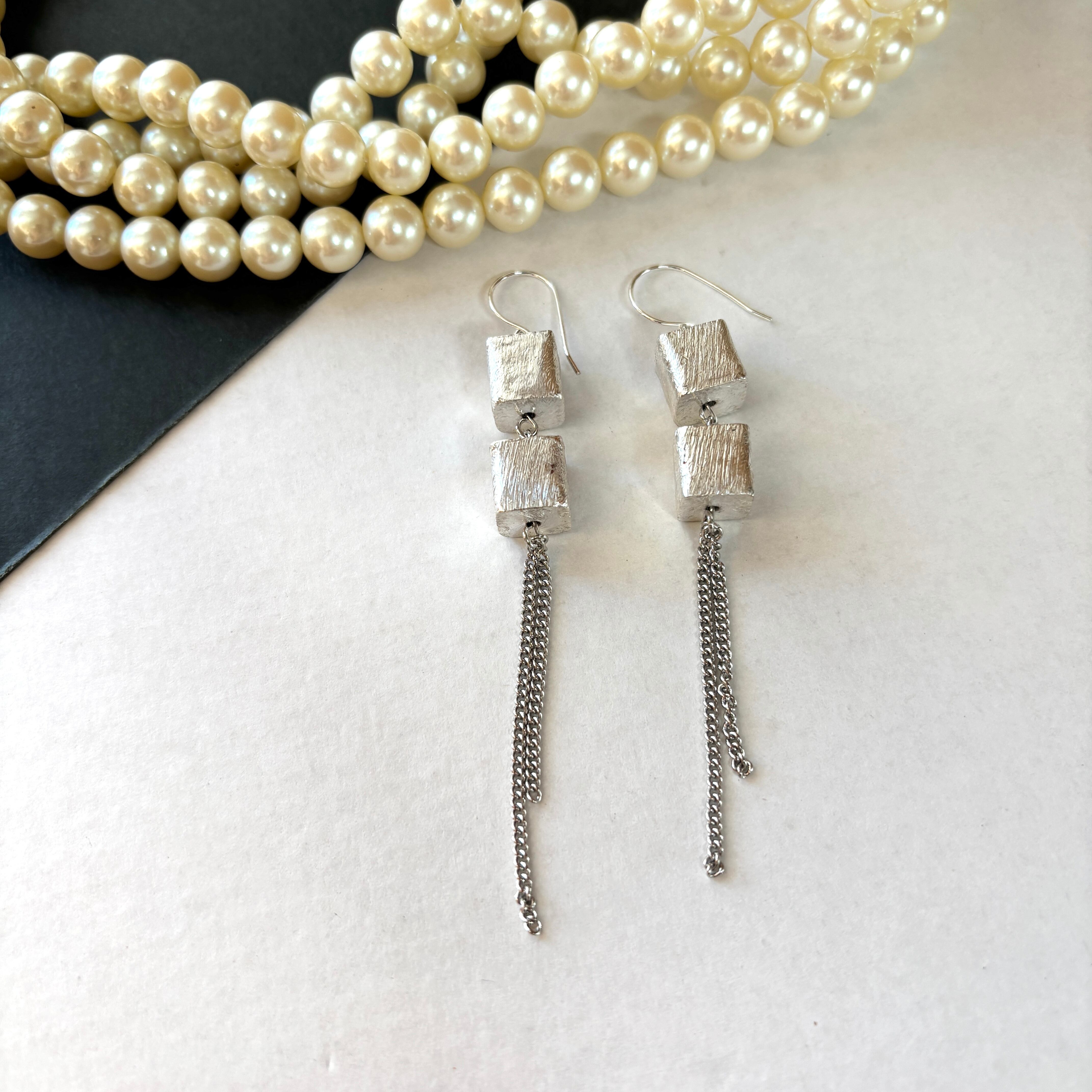 洗練されたシルバーの輝きのキューブと耳元で揺れる繊細なチェーンを組み合わせたクールでエレガントなピアスです。